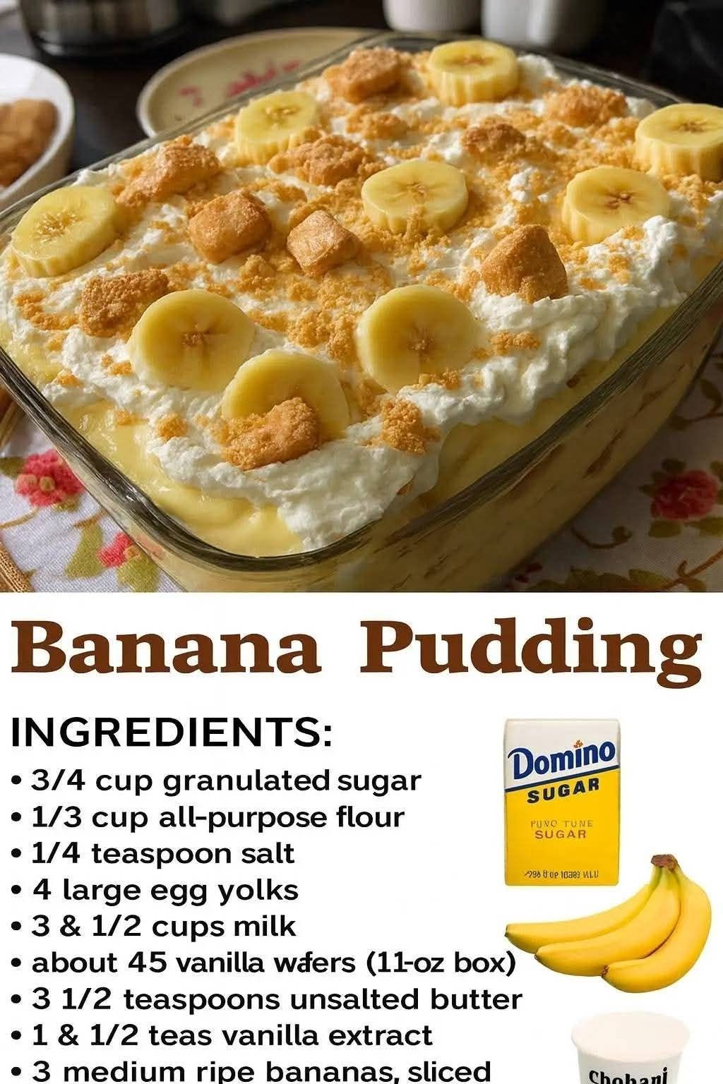 Here is a classic Southern Banana Pudding recipe—creamy, rich, and layered with soft bananas and vanilla wafers. This is the old-fashioned pudding-from-scratch version (with an optional no-cook shortcut at the end).