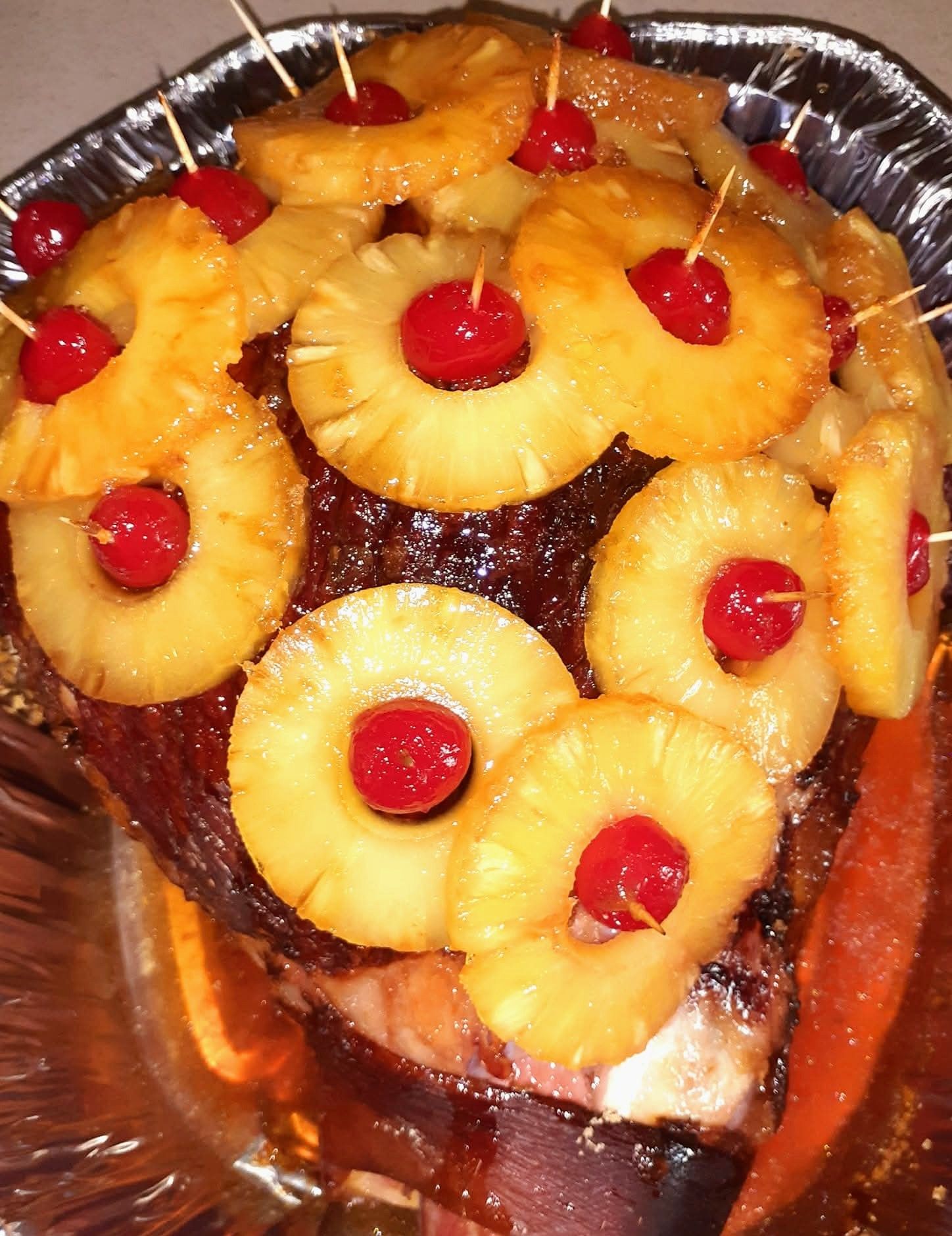 During the last 30 minutes of baking, remove foil and attach pineapple rings and cherries to the ham with toothpicks. Brush with more glaze and continue baking uncovered to caramelize.
